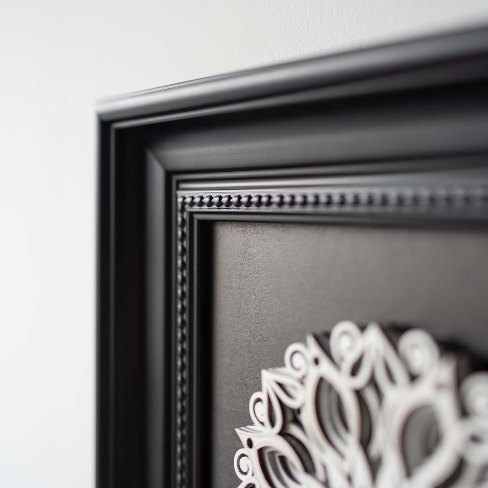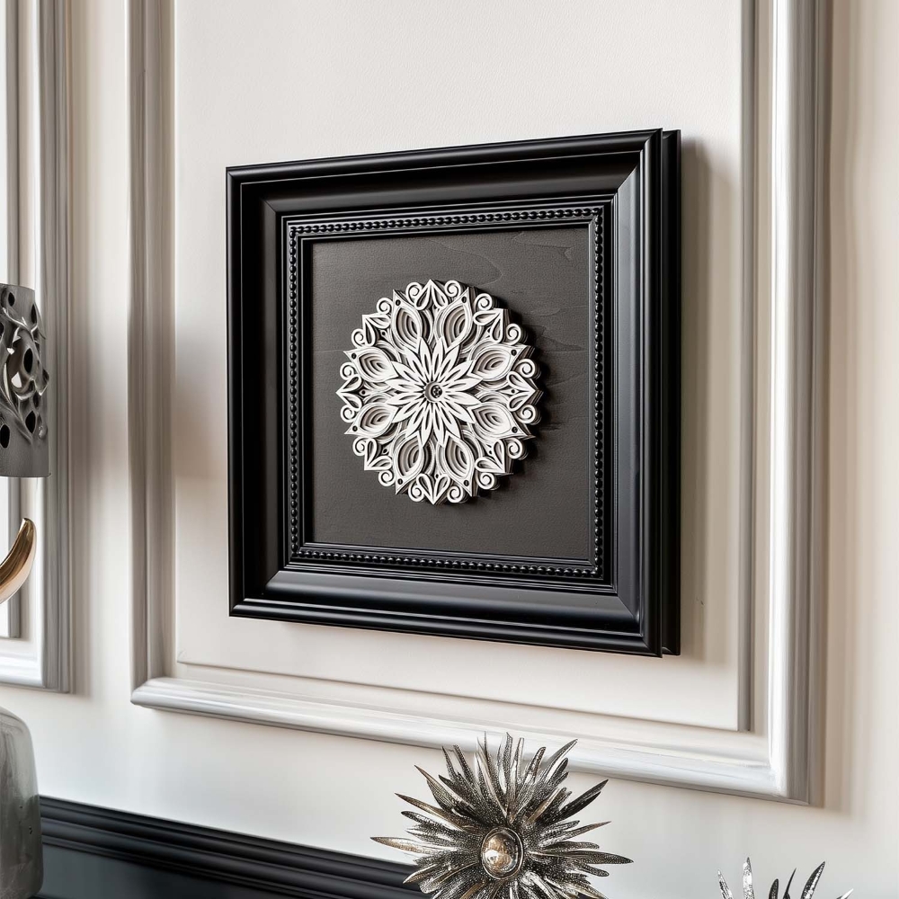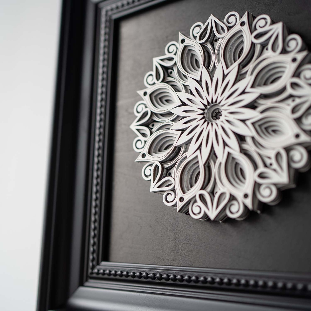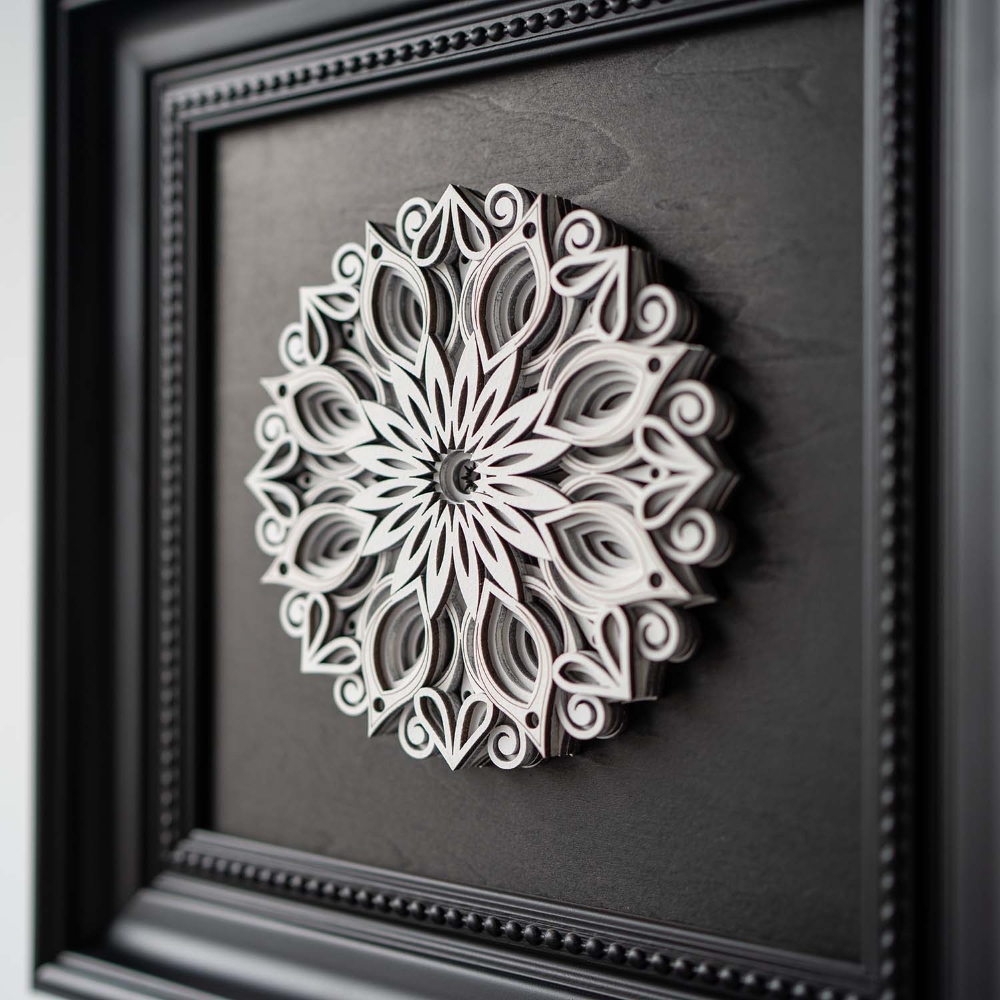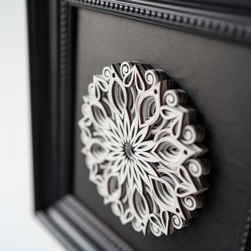 Each layer of this 3D wood sculpture is hand-assembled to create mesmerizing depth. Inspired by the duality of nature's geometry, the slightly charred edges echo ancient woodcraft traditions, while the precision-cut patterns reveal modern artistry.